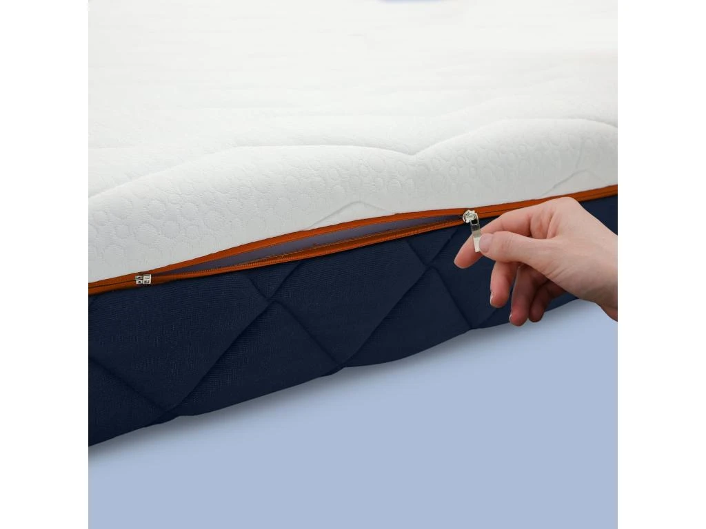 La housse du matelas double 120 x 190 est capable de dissiper l’humidité produite par le corps pendant le sommeil et est hypoallergénique, anti-acariens et antibactérienne. Elle est munie d’une fermeture éclair rouge pratique qui s’ouvre sur les quatre côtés, ce qui permet de la retirer et de la laver confortablement. Vous pouvez la laver à la main ou en machine à laver à une température maximale de 40°C. Important : ne pas utiliser de détergents particulièrement agressifs tels que l’eau de Javel, ne pas sécher au sèche-linge et ne pas repasser.
