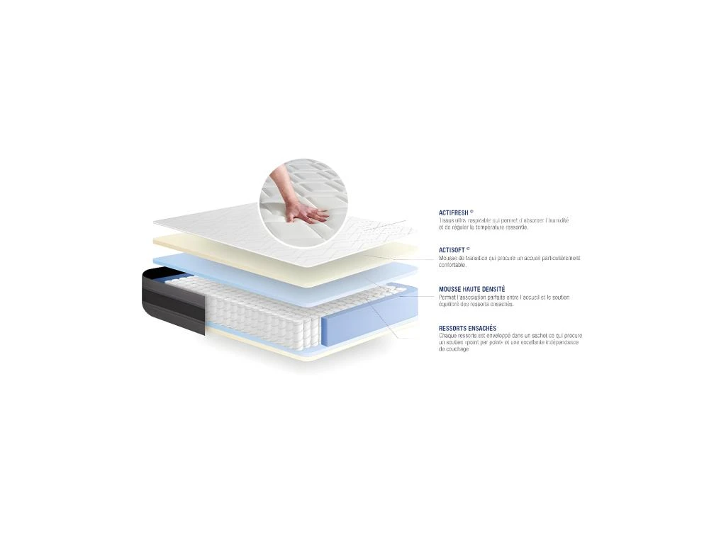 Fabrication européenne – 5 zones de confort – Réversible face été/hiver tête/pieds – Système actifresh qui permet une meilleure aération du matelas et assure une meilleure hygiène.