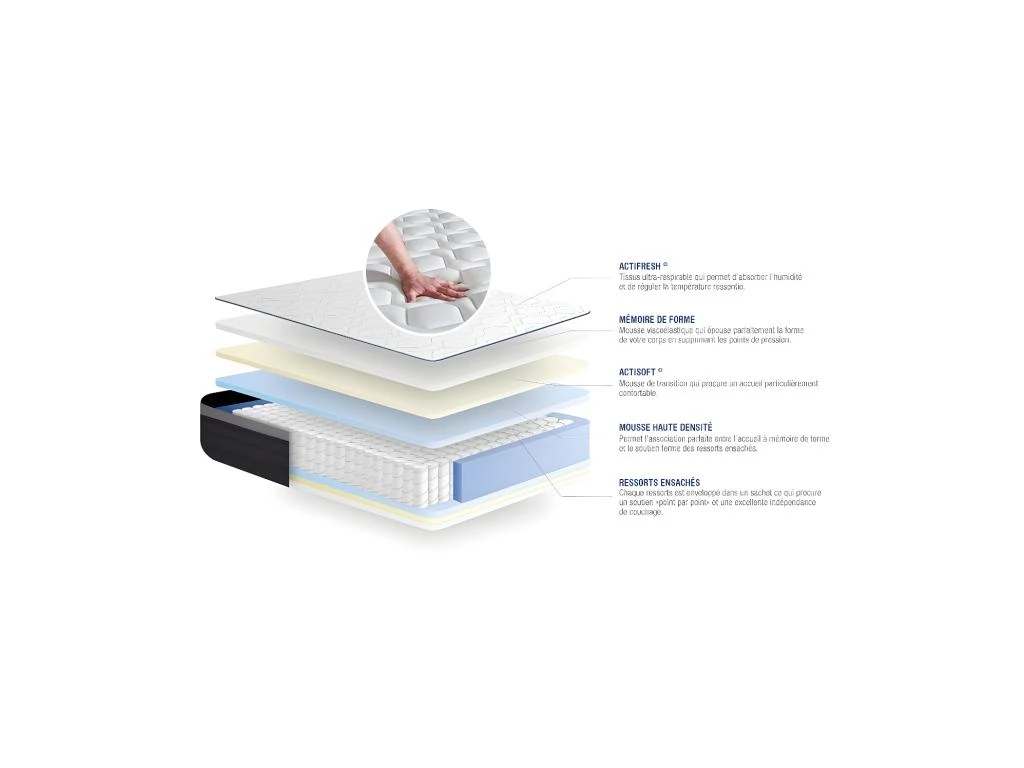 Fabrication européenne – 7 zones de confort – Réversible face été/hiver tête/pieds – Système actifresh qui permet une meilleure aération du matelas et assure une meilleure hygiène.