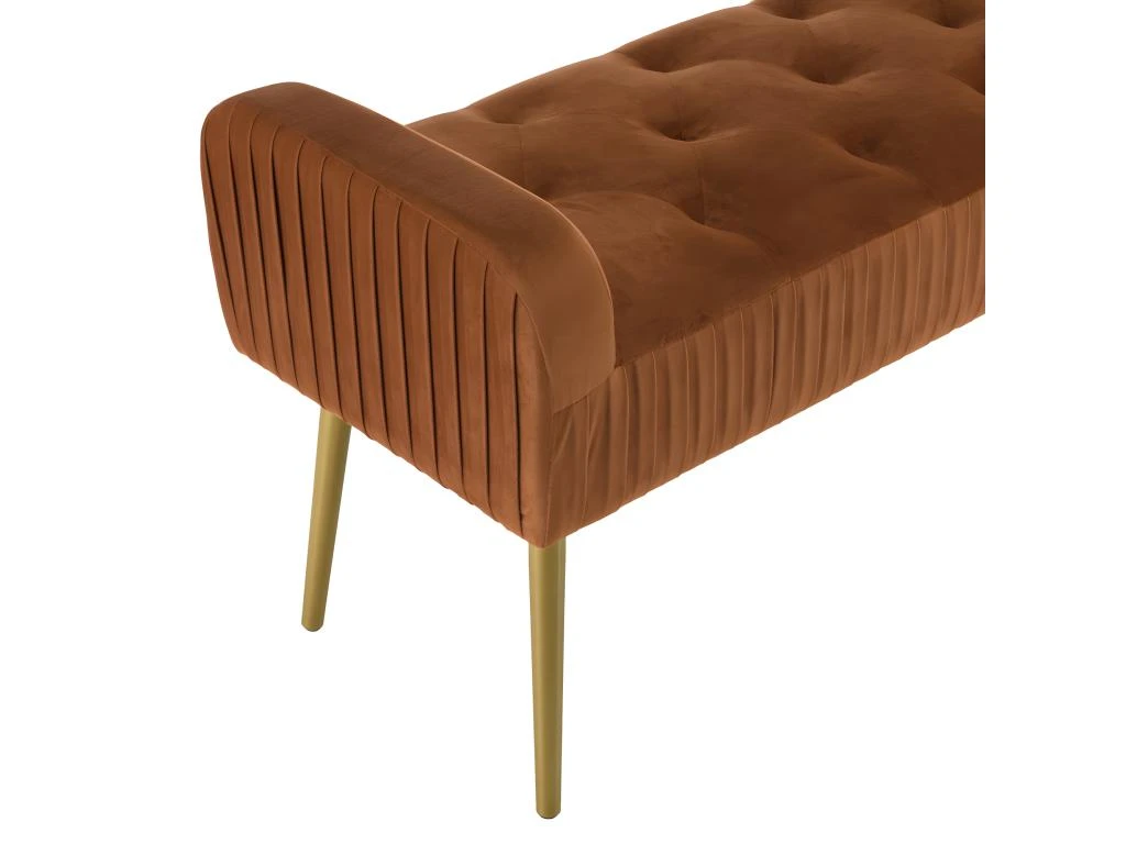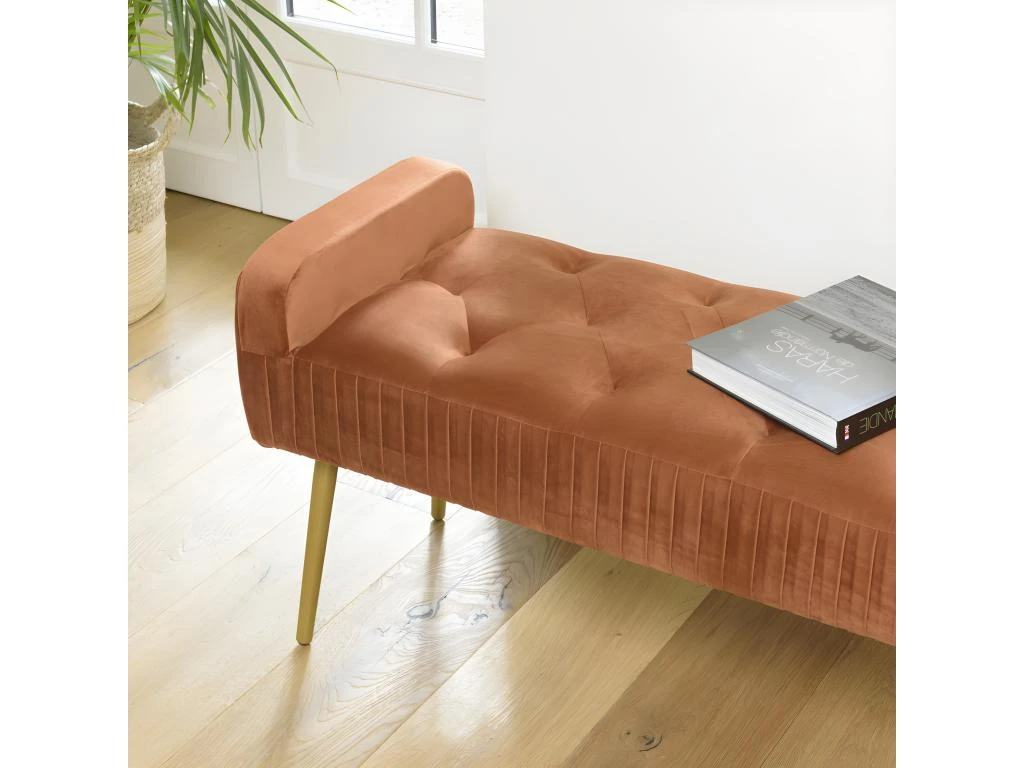 Banc de lit en velours orange pieds métal doré. Dimensions : 103 x 40 x 53 cm. Article en Velours polyester/ Mousse/ Acier/ Contreplaqué.