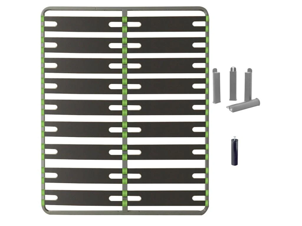 Sommier : Composé de 2×9 lattes larges multiplis largeur 151 mm, épaisseur 8 mm. Embouts en polypropylène vert. Structure tube métal carré, laqué epoxy coloris gris. Coins arrondis.