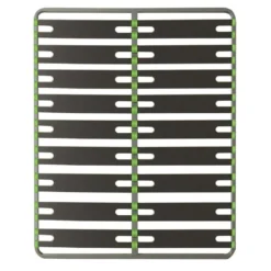 Il est composé de 2×9 lattes larges multiplis largeur 151 mm, épaisseur 8 mm. Embouts en polypropylène vert. Structure tube métal carré, laqué epoxy coloris gris. Coins arrondis.