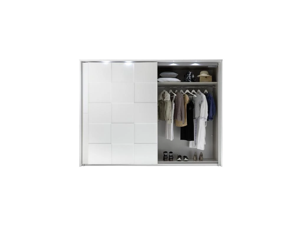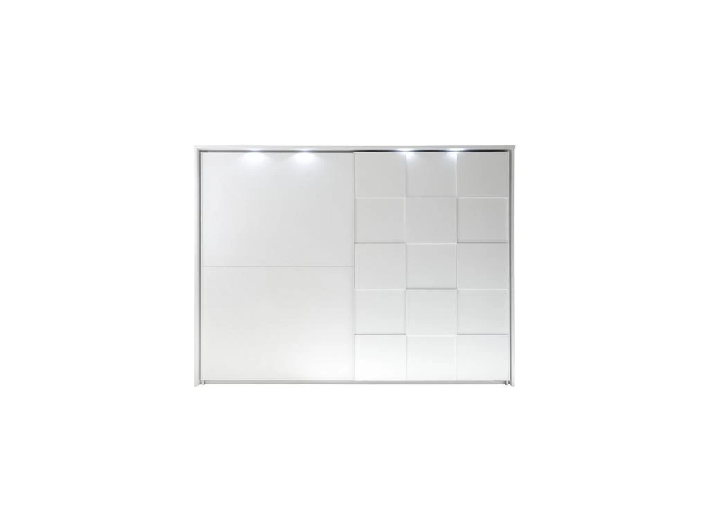Une des portes met en avant un damier en relief qui apporte du volume et qui offre une qualité perçue réellement haut de gamme pour un agrément visuel tout particulier. L’autre porte est pourvue de 2 panneaux. Les 2 portes sont mises en valeur par un éclairage LED’s soulignant le design et apportant un éclairage indirect agréable dans la chambre.