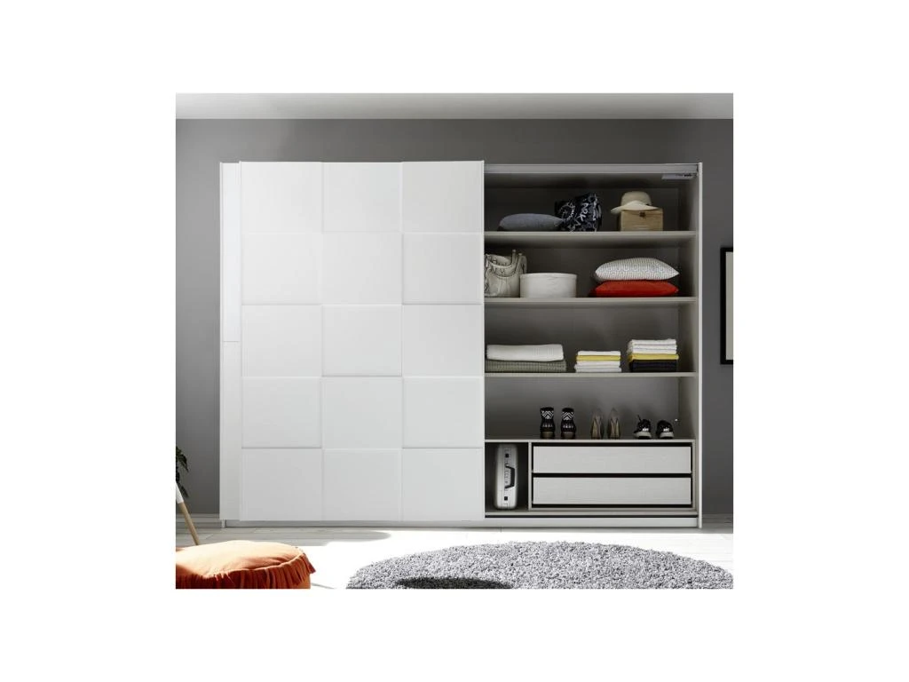 Cette immense armoire est munie de portes coulissantes, l’ouverture de ces grandes portes ne nécessite aucun dégagement pour une solution gain de place efficace.
