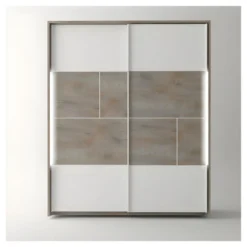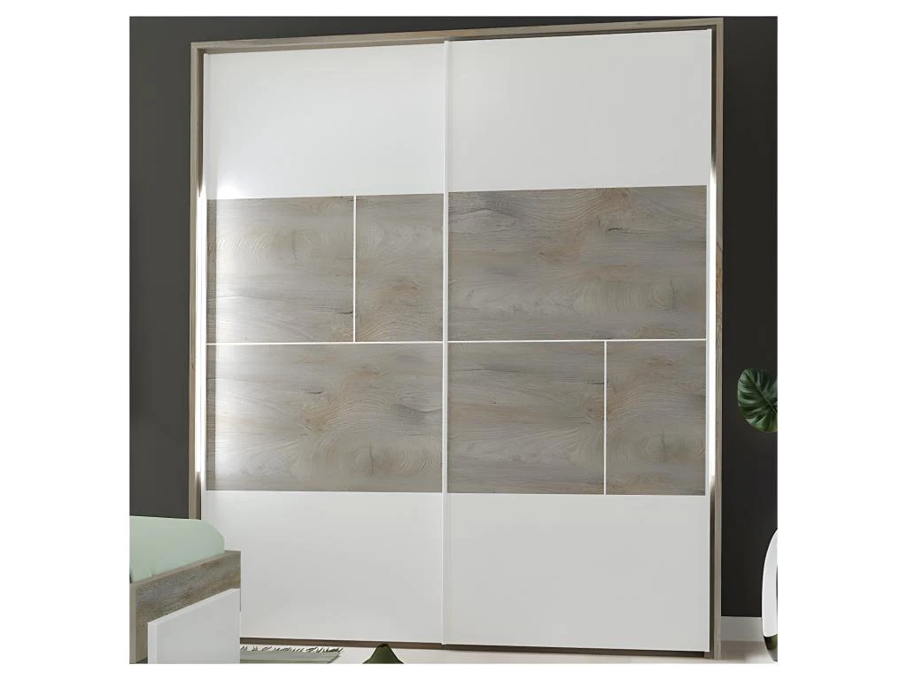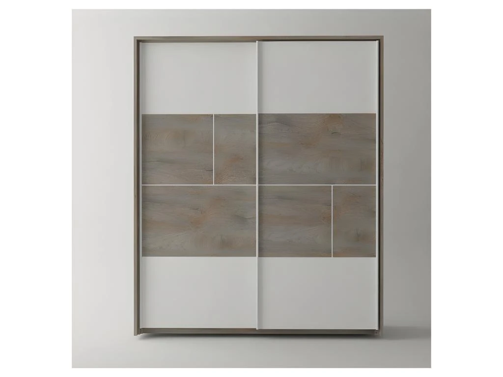 Magnifiez votre chambre avec cette armoire 2 portes coulissantes mettant en avant un revêtement bois de Chêne délavé marié à une laque blanc mat du plus bel effet et dans l’air du temps.