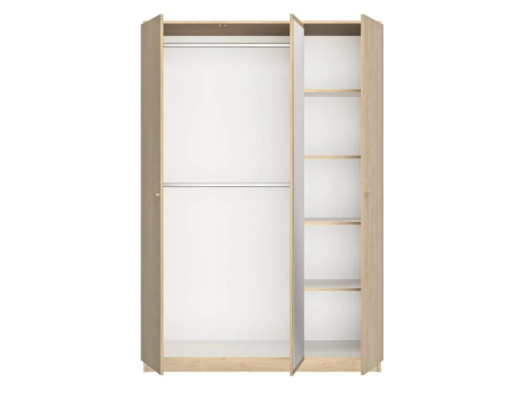 Pour un apport de luminosité dans votre chambre à coucher la porte centrale de cette armoire à la dimension optimisée est habillée d’un miroir, elle complète ainsi la clarté de la finition Chêne Blond.