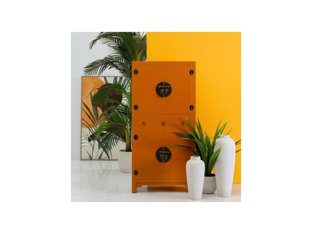 La teinte orange se marie aux sculptures, parfaitement raccord avec le style oriental de ce meuble multifonction sobre et élégant.