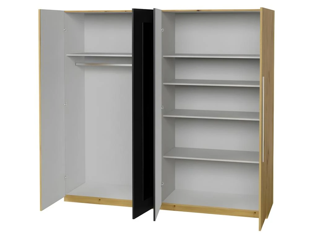 Cette garde robe sublimera votre chambre avec son coloris chêne sonoma et noir. Composée de 4 portes dont 2 avec miroirs. Les 2 grands miroirs intégrés seront parfaits pour vos séances d’essayage et apporteront clarté et luminosité à votre chambre. L’intérieur est muni de nombreux espaces de rangements : 1 grande penderie et 6 étagères afin d’en faire un dressing qui accueillera aisément toute votre garde-robe.