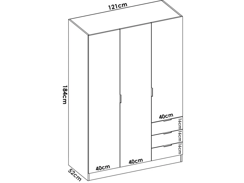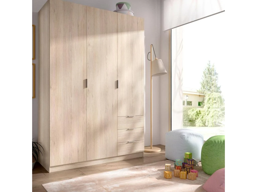 STRUCTURE ET UTILISATION – Armoire complète avec trois portes battantes avec quatre étagères et une tringle à vêtements et trois tiroirs – Grâce à l’organisation interne de ses espaces, elle offre un grand espace de rangement – Toute la structure du meuble est parfaite pour un ameublement peu encombrant une chambre parentale, une chambre d’enfant ou une chambre d’amis – Les étagères intérieures associées à la tringle à vêtements vous permettront de ranger vos vêtements et costumes de manière ordonnée.
