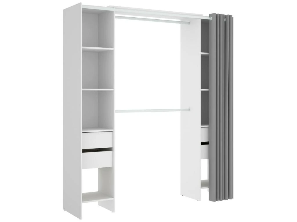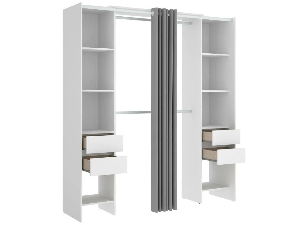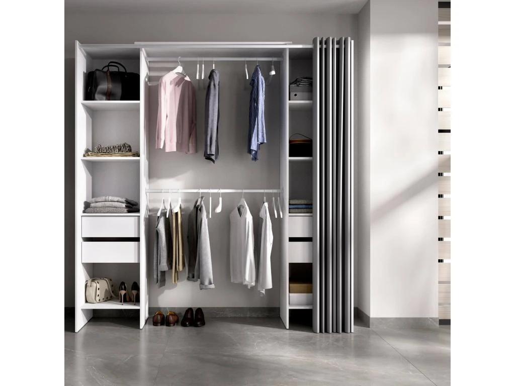 STRUCTURE ET UTILISATION – Armoire avec rideau, composée de deux colonnes avec quatre étagères et deux tiroirs et deux tringles centrales – Grâce à l’organisation interne de ses espaces, elle offre un grand espace de rangement – Toute la structure du meuble est parfaite pour décorer de manière peu encombrante une chambre parentale, une chambre d’enfants ou une chambre d’amis – Les étagères associées à la tringle à vêtements vous permettront de ranger vos vêtements et costumes de manière ordonnée.