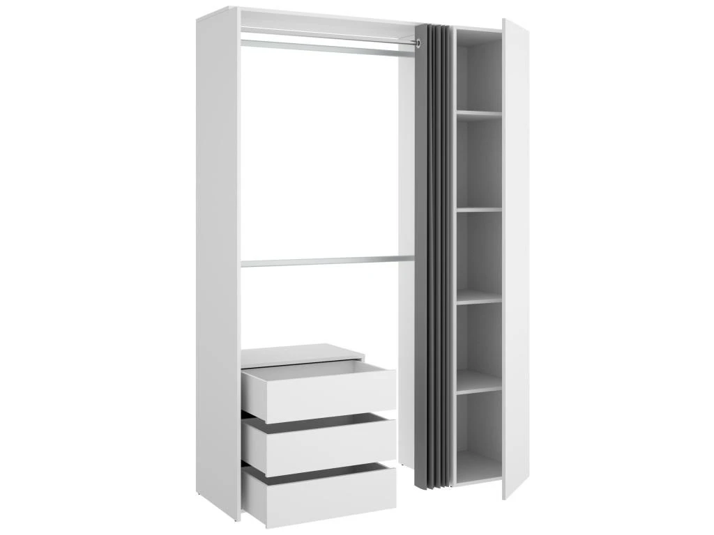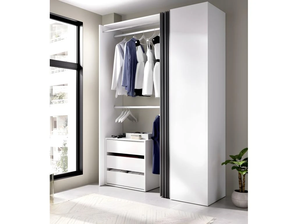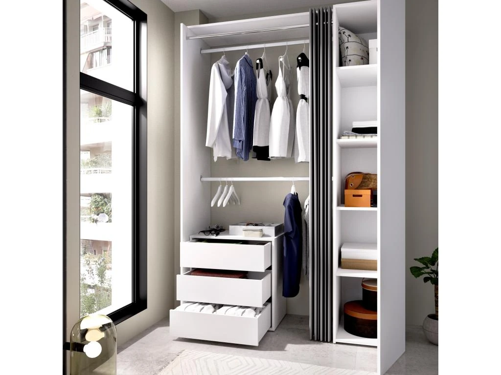 STRUCTURE ET UTILISATION – Armoire à rideau complète avec une armoire à colonnes avec porte battante et cinq compartiments internes, une commode avec trois grands tiroirs et deux tringles à vêtements – Grâce à l’organisation interne de ses espaces, elle offre un grand espace de rangement – L’ensemble du meuble la structure est parfaite pour meubler une chambre double, une chambre d’enfants ou une chambre d’amis de manière peu encombrante – Les étagères internes combinées à la tringle à vêtements vous permettront de ranger les vêtements et les robes de manière ordonnée.