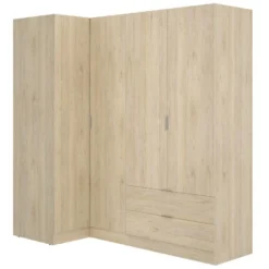 STRUCTURE ET UTILISATION – Armoire d’angle complète avec sept compartiments, deux grands tiroirs et trois barres de cintre, toutes à l’intérieur de portes battantes pratiques – Grâce à l’organisation interne de ses espaces, elle offre un grand espace de rangement – Toute la structure de l’armoire est parfaite pour meubler une chambre double, une chambre d’enfants ou une chambre d’amis de manière peu encombrante – Les étagères intérieures combinées à la tringle à vêtements vous permettront de ranger les vêtements et les robes de manière ordonnée.