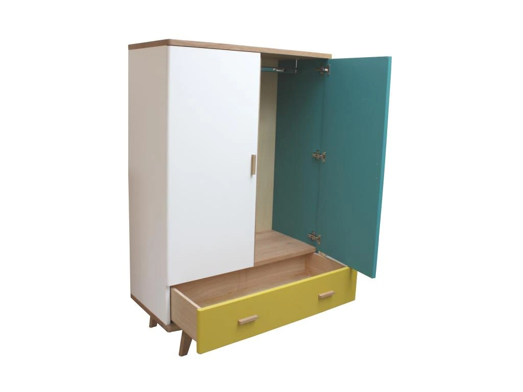 2 portes avec ralentisseurs, en laqué bleu canard et jaune citron.