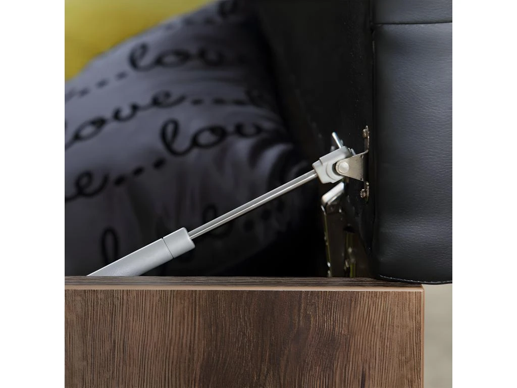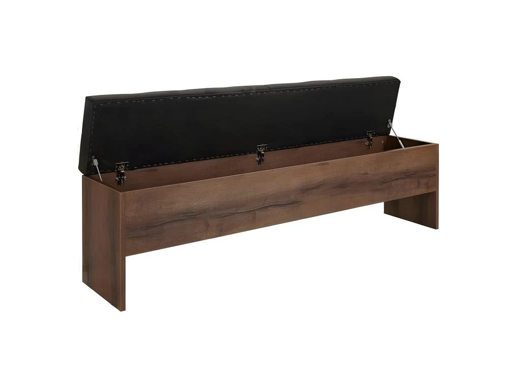 - COMPOSITION : Structure en panneaux de particules 15 et 22 mm d’épaisseur. Revêtement papier décor chêne foncé. Panneaux arrière en HDF 2 mm. Assise rembourrée et capitonnée en PU noir 75 mm. Vérins à gaz permettant l’ouverture du coffre.