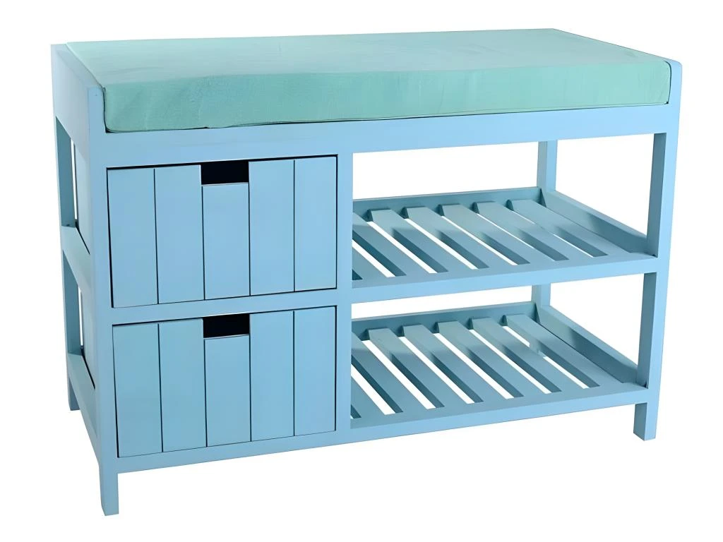 Banc en bois Seuni de marque Atmosphera. Pour meubler et décorer la chambre de votre enfant. Banc avec 2 tiroirs, sans poignée ouverture par encoche, 2 étagères et 1 coussin d’assise. En bois massif de paulownia, bois très léger, coussin en mousse PU et tissu coton et polyester. Coloris bleu. Dimensions 69×34 cm, hauteur 48 cm. Poids 4,7 kg.