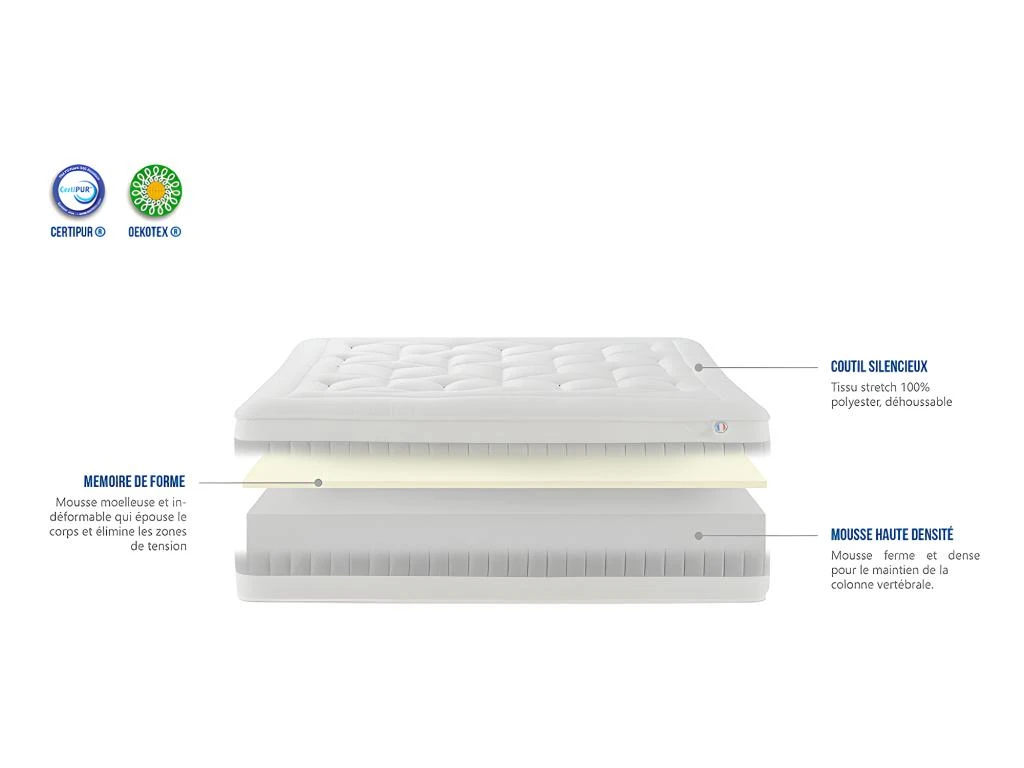 - Âme intérieure du matelas (certifiée CertiPUR) : 23 cm de mousse Haute Densité de 33 kg/m³ + 4 cm de mousse viscoélastique à mémoire de forme de 60 kg/m³