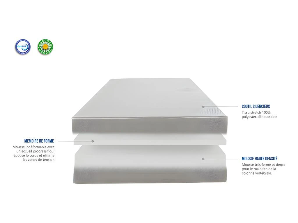 - Âme intérieure du matelas (certifiée CertiPUR) : 18 cm de mousse Haute Densité de 28 kg/m³ + 3 cm de mousse viscoélastique à mémoire de forme de 50 kg/m³