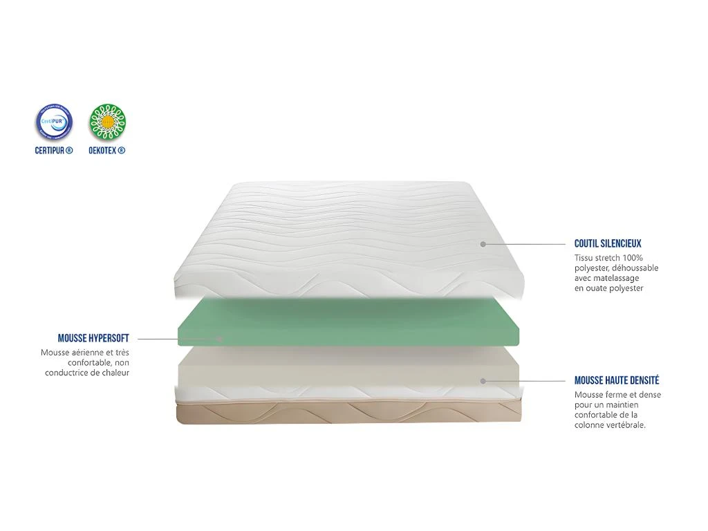 - Âme intérieure du matelas (certifiée CertiPUR) : 14 cm de mousse Haute Densité et Haute Résilience de 40 kg/m³ + 7 cm de mousse hypersoft Haute Résilience de 55 kg/m³