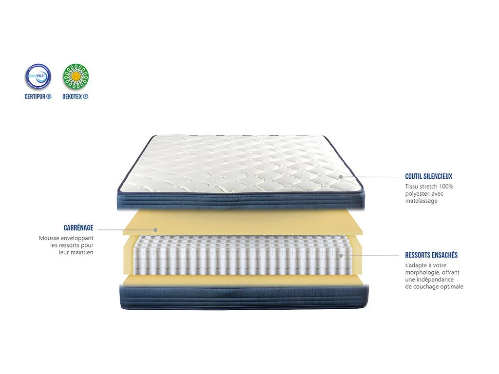 - Âme intérieure du matelas (certifiée CertiPUR) : Ressorts ensachés de 17 cm + 2 cm de mousse de confort de 20 kg/m³ (dessus et dessous les ressorts)
