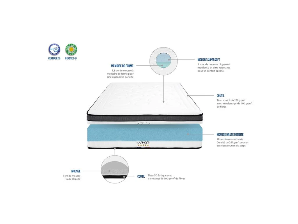 - Âme intérieure (certifiée CertiPUR) : 18 cm de mousse Haute Densité de 28 kg/m³