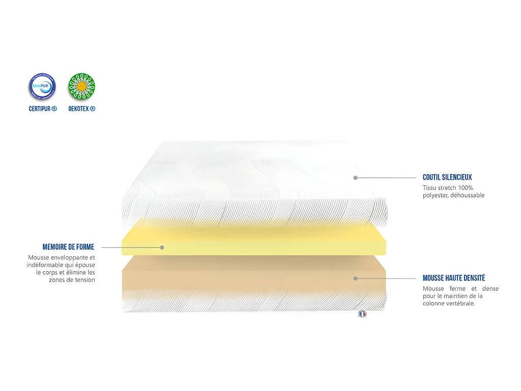 - Âme intérieure (CertiPUR) : 17,5 cm de mousse Haute Densité de 33 kg/m³ + 6,5 cm de mousse viscoélastique à mémoire de forme AIR OPTIMA® de 60 kg/m³