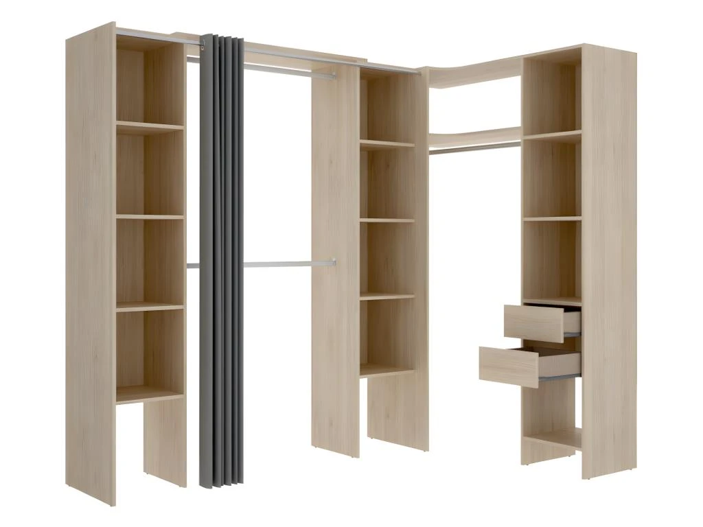 Composé de 13 niches et de 3 penderies, le dressing d’angle DORIAN sera votre allié pour ranger l’ensemble de votre garde-robe tout au long de l’année. Son rideau apportera la touche de modernité à ce dressing à la fois fonctionnel et élégant.