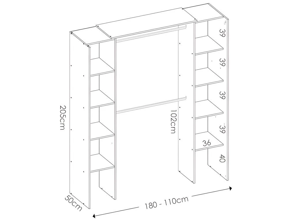 Ce dressing est extensible de 164 à 234 cm grâce à sa barre de penderie recoupable.