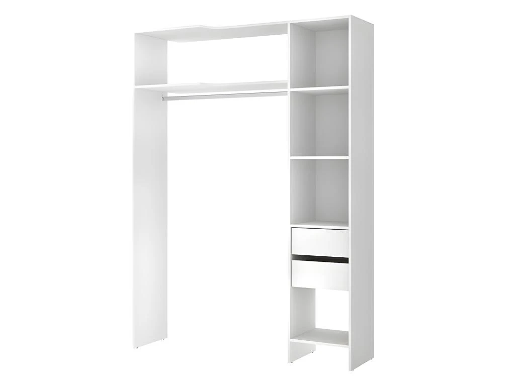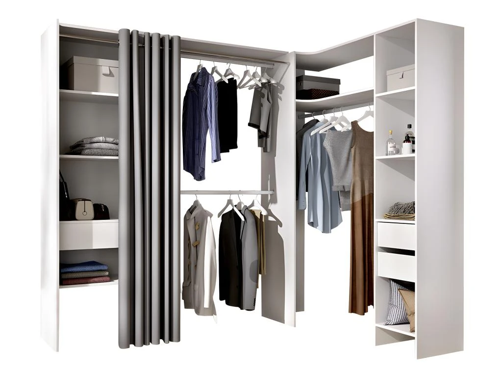Aussi, la partie du dressing qui comporte deux penderies est extensible de 110 à 160 cm grâce à sa barre de penderie recoupable. Pour ajuster la longueur, il vous suffit simplement de couper la barre de penderie à la longueur souhaitée.