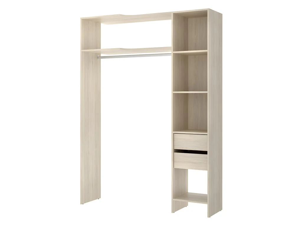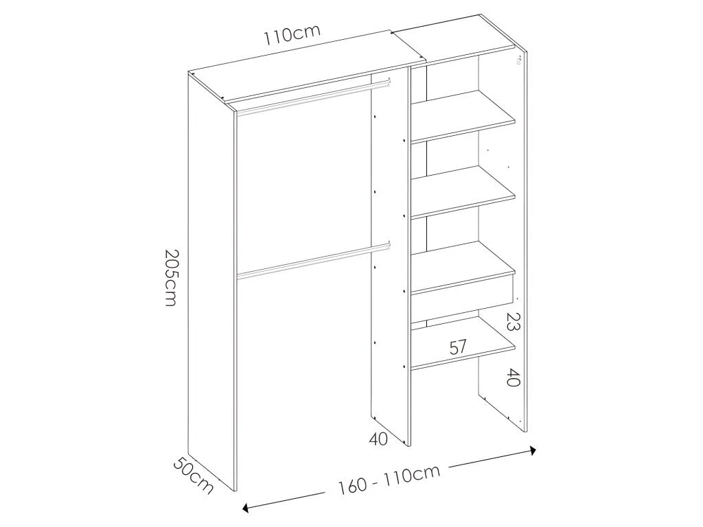 Aussi, la partie du dressing qui comporte deux penderies est extensible de 110 à 160 cm grâce à sa barre de penderie recoupable. Pour ajuster la longueur, il vous suffit simplement de couper la barre de penderie à la longueur souhaitée.