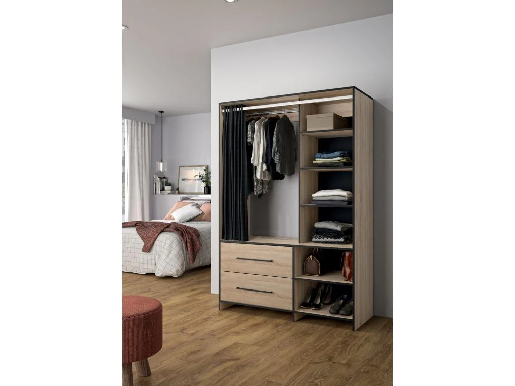 L’imposant dressing JUNGO vous offre des espaces de rangements incomparables. Équipé de 2 grands tiroirs à coulisses et de 7 niches ouvertes, vous bénéficiez également d’une penderie parfaite pour vos chemisiers/chemises, vestes ou costumes. Son rideau en coton assure également une protection supplémentaire de vos habits en recouvrant l’entièreté de la façade de JUNGO.