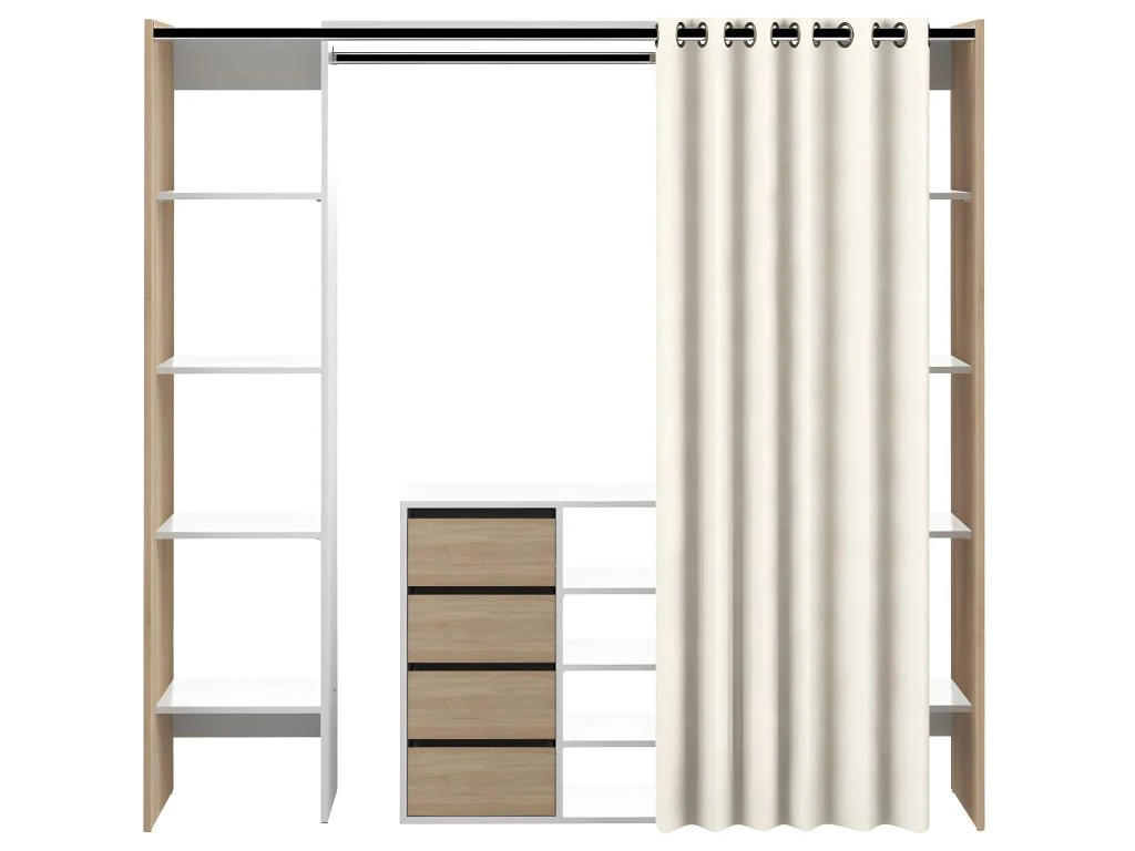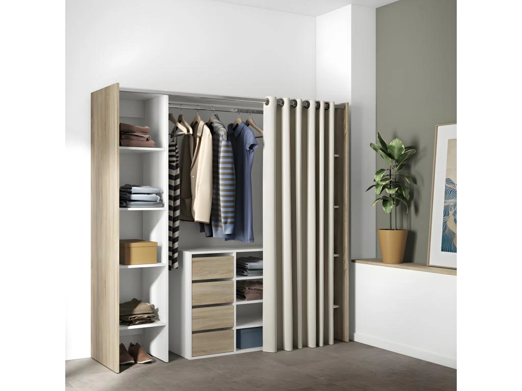 Fonctionnel et discret, grâce à un module de penderie et de 8 étagères réglables, le dressing TOM se fixe au mur et s’adapte à vos besoins et envies au fil du temps.