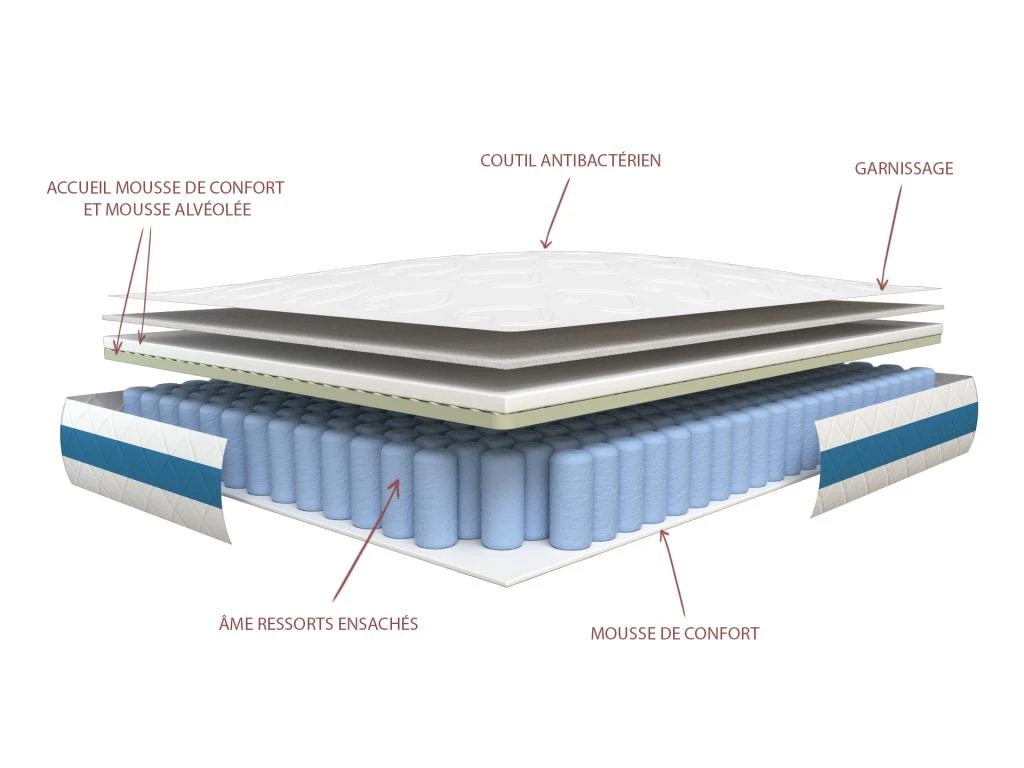 Technique de pointe en matière de ressorts; chaque ressort est emballé dans une enveloppe fermée lui permettant de bouger individuellement et offrant ainsi un soutien point par point très précis et une excellente indépendance de couchage