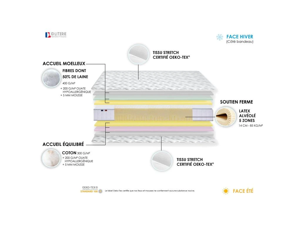 LATEX : Il faut savoir que le matelas en latex est parmi les matelas les plus aérés. C’est un très bon régulateur de chaleur et d’humidité. Grâce à sa densité, vous obtenez un matelas ferme et un bon soutien.