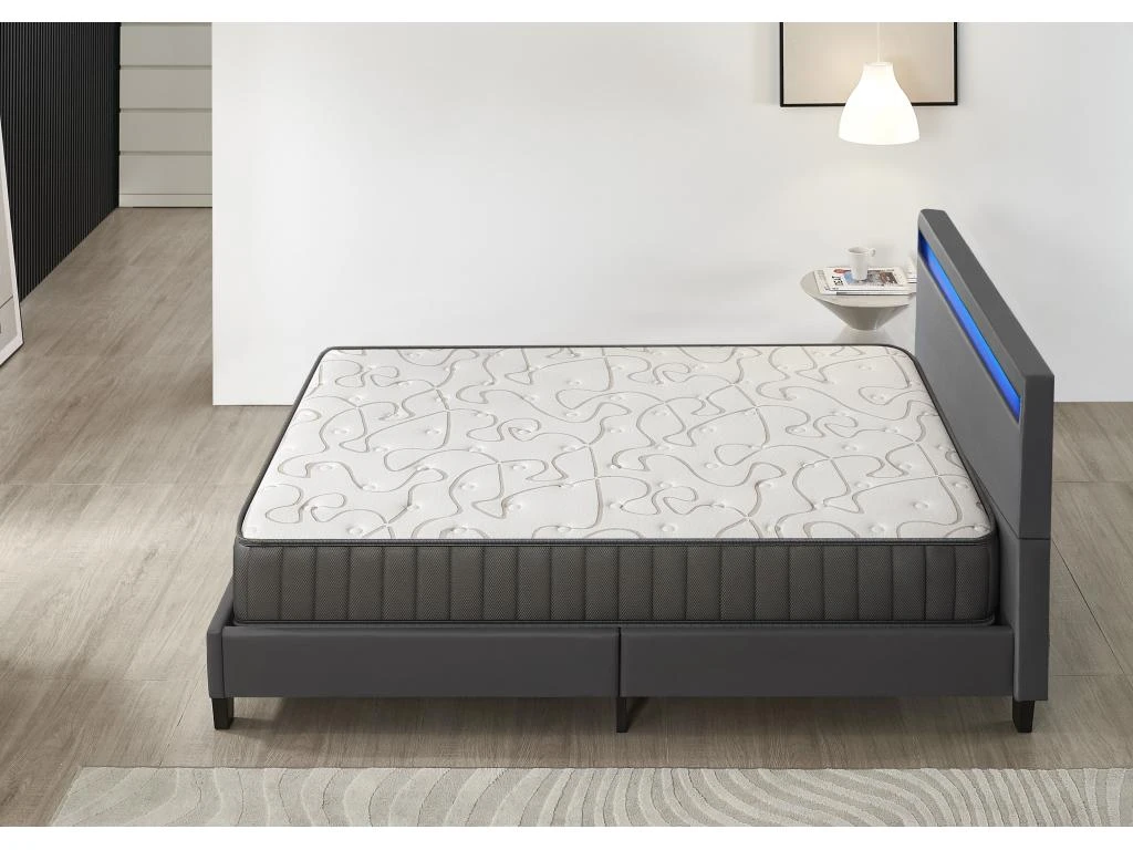 Notre lit vous apportera à coup sûr une touche de modernité dans votre chambre à coucher. Sa tête de lit rembourrée contient un éclairage led, dont vous pourrez modifier à volonté la couleur et les effets de lumière selon vos envies.. Le design élégant de ce lit est également marqué par son revêtement en synthétique. La stabilité du lit est assurée par 4 pieds robustes et renforcée par la présence d’une traverse centrale et de 4 pieds de soutien supplémentaire sous le sommier à lattes, ce dernier est inclus dans la livraison.