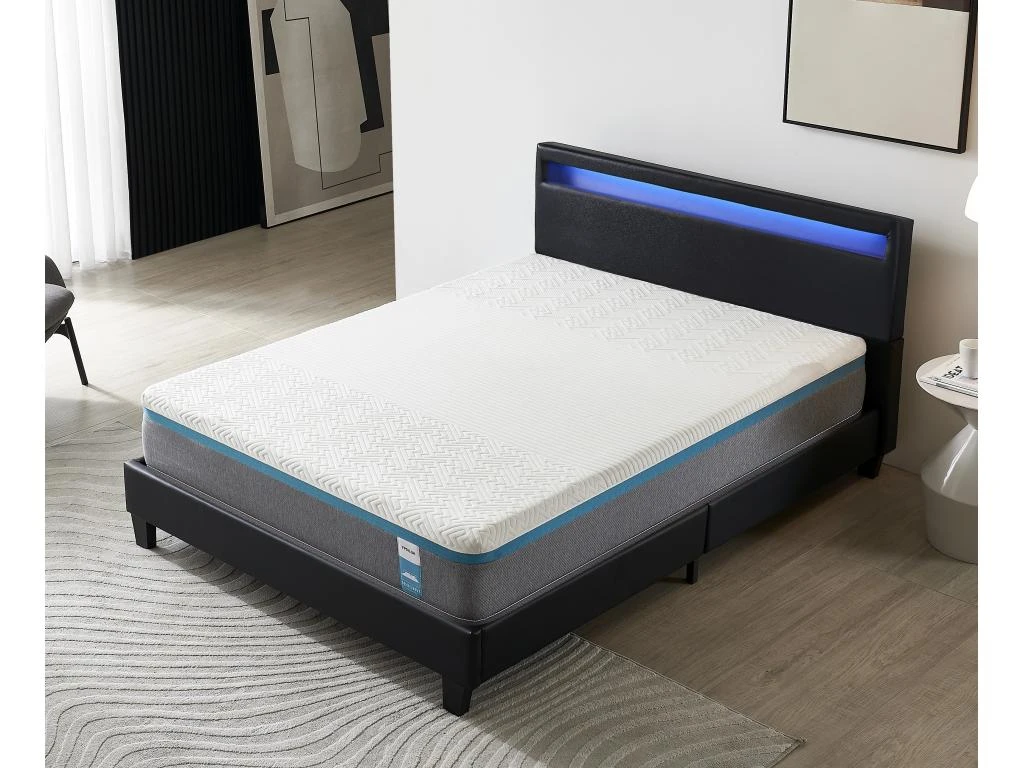 Notre lit vous apportera à coup sûr une touche de modernité dans votre chambre à coucher. Sa tête de lit rembourrée contient un éclairage led, dont vous pourrez modifier à volonté la couleur et les effets de lumière selon vos envies. Le design élégant de ce lit est également marqué par son revêtement en synthétique. La stabilité du lit est assurée par 4 pieds robustes et renforcée par la présence d’une traverse centrale et de 4 pieds de soutien supplémentaire sous le sommier à lattes, ce dernier est inclus dans la livraison.