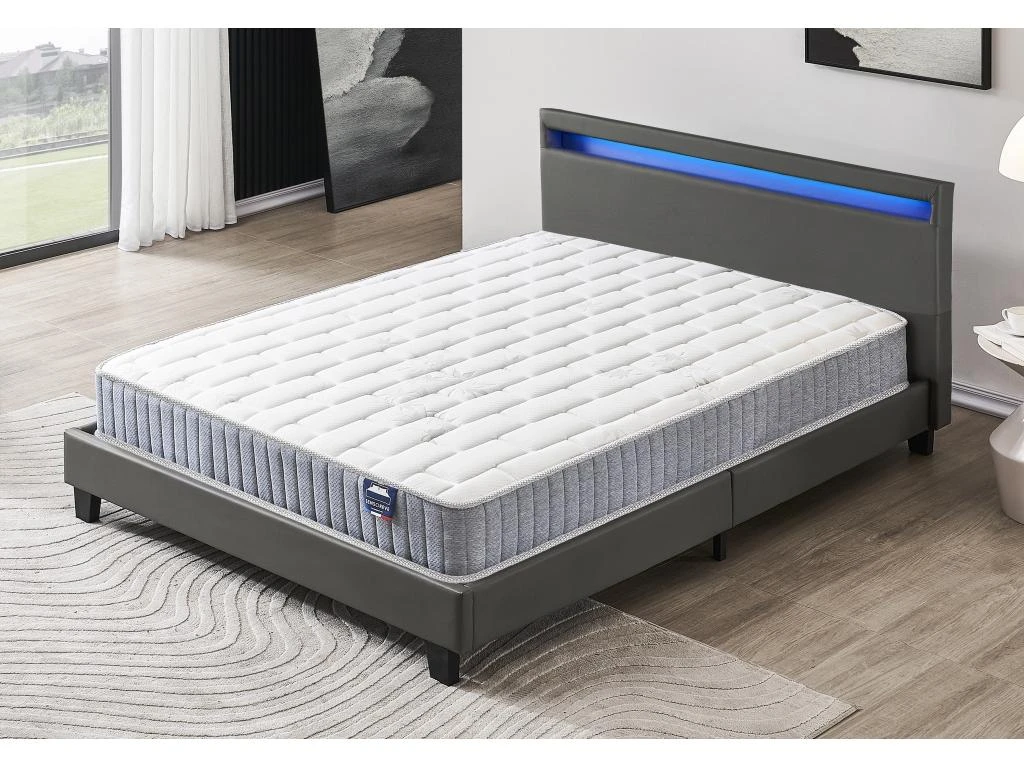 Notre lit vous apportera à coup sûr une touche de modernité dans votre chambre à coucher. Sa tête de lit rembourrée contient un éclairage led, dont vous pourrez modifier à volonté la couleur et les effets de lumière selon vos envies. Le design élégant de ce lit est également marqué par son revêtement en synthétique. La stabilité du lit est assurée par 4 pieds robustes et renforcée par la présence d’une traverse centrale et de 4 pieds de soutien supplémentaire sous le sommier à lattes, ce dernier est inclus dans la livraison.