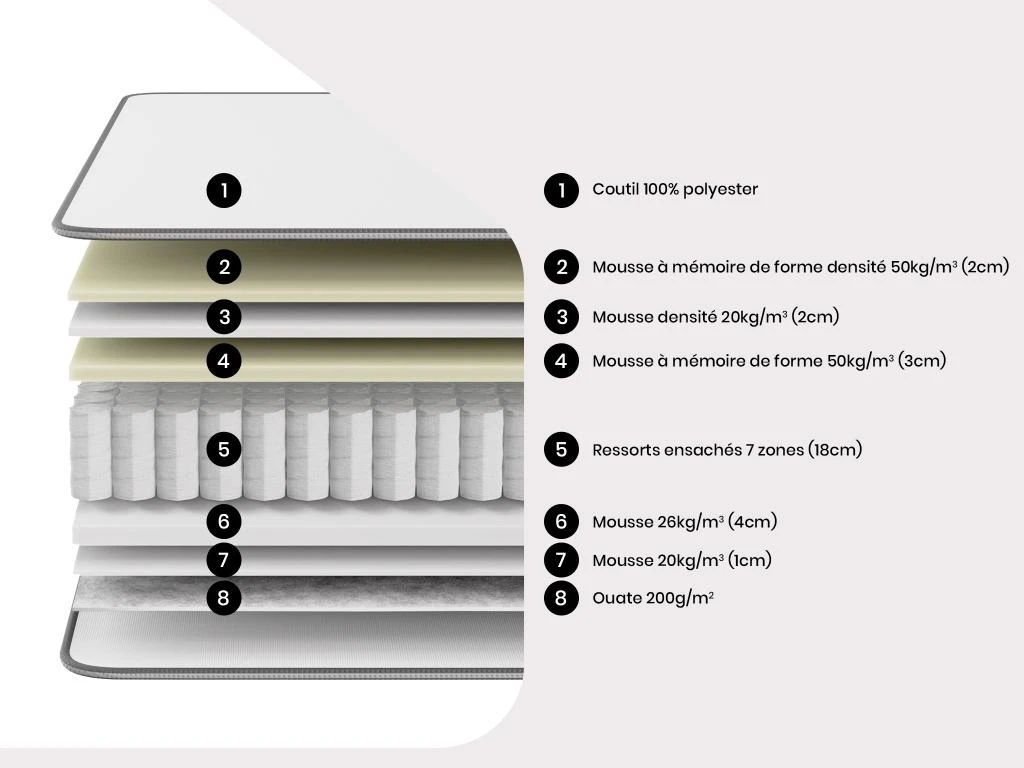 Technique de pointe en matière de ressorts; chaque ressort est emballé dans une enveloppe fermée lui permettant de bouger individuellement et offrant ainsi un soutien point par point très précis et une excellente indépendance de couchage