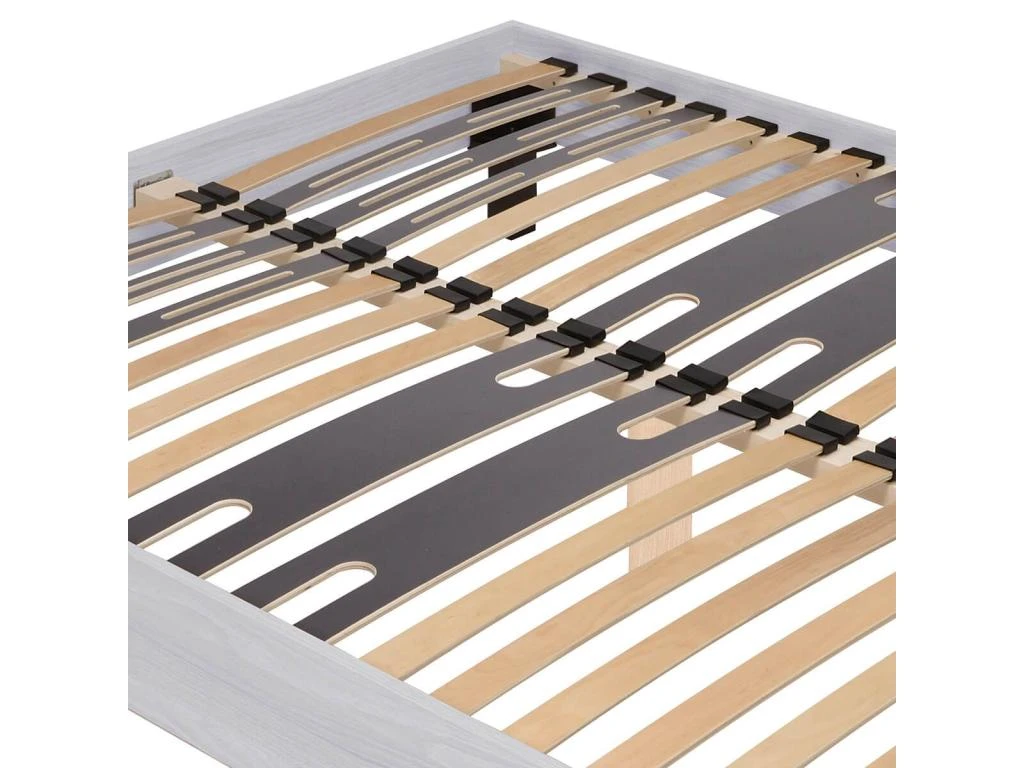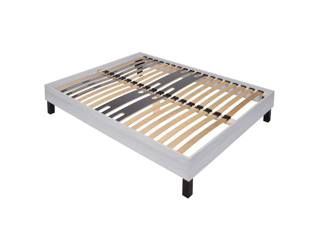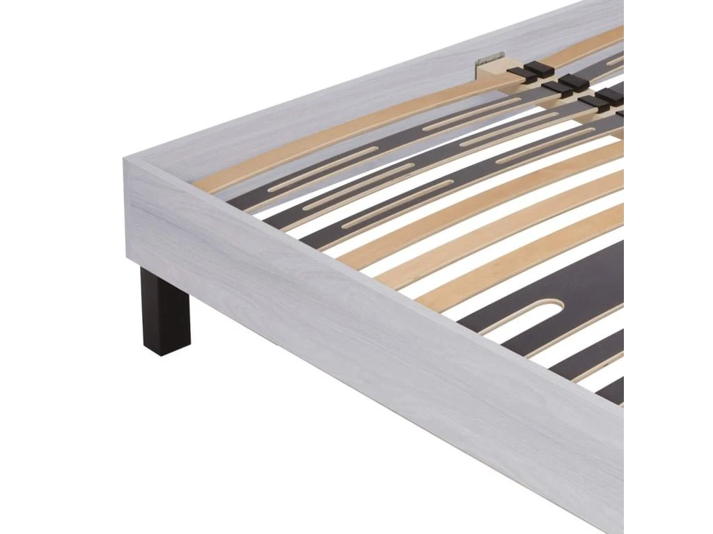 Structure en panneaux de particules, finition déco mélaminé aspect frêne blanchi. Lattes multiplis en bois largeur 53mm. Lattes doubles renfort bassin en bois largeur 151mm. Lattes simples renfort épaules en bois largeur 53mm. Embouts lattes en polyprolylène. Hauteur encadrement : 19cm. 5 pieds bois inclus. Hauteur totale : 35cm. Hauteur couchage (pied / sommier) : +/- 31cm.