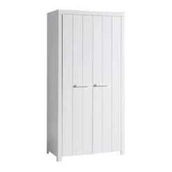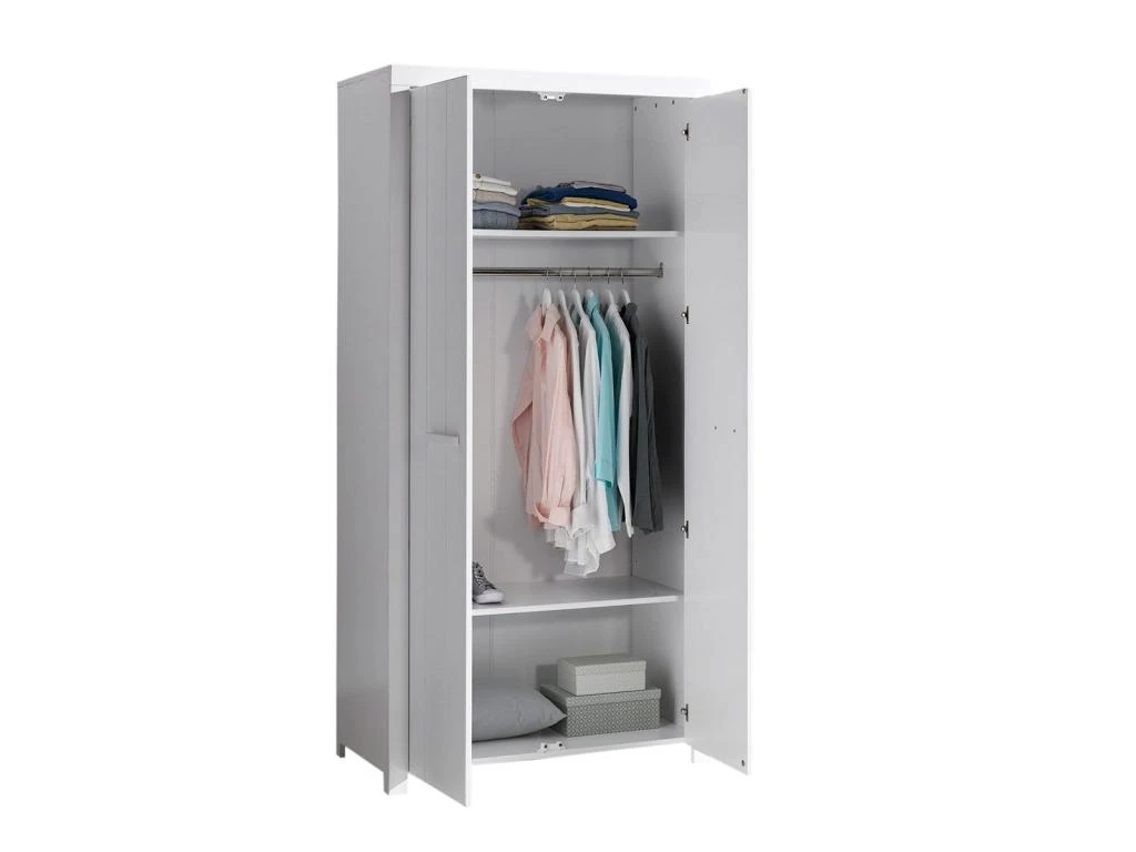 Structure en mdf et pin massif laqué blanc. Dispose d’une penderie et de 2 étagères. Portes avec Système Soft-Close.