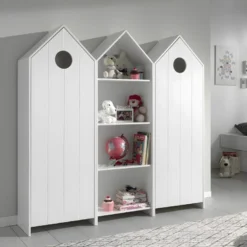 Ensemble composé d’une Bibliothèque à 4 Niveaux Blanche, de 2 Armoires Penderie 1 Porte Blanches, en forme de cabane de plage, de la gamme Havre.