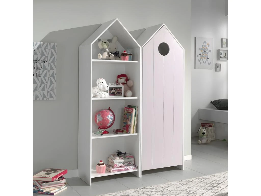 Ensemble composé d’une Bibliothèque à 4 Niveaux Blanche et d’une Armoire Penderie 1 Porte Rose, en forme de cabane de plage, de la gamme Havre.