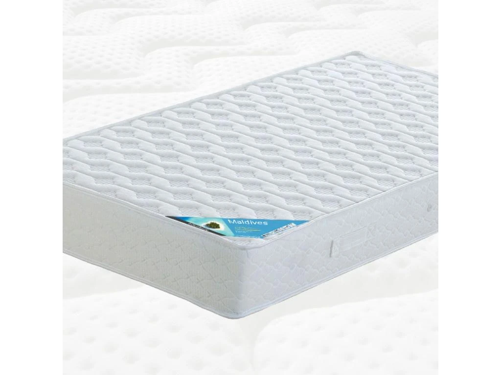Matelas Maldives : Mousse Aertech plus H:18 cm, densité 35 Kg/m3, Housse supérieure et inférieure matelassée fixe composée de Tissu Stretch anti-acariens et hypoallergénique 100% polyester 180 g/m2, Rembourrage Thermoflex B 450 g/m2 ( 60% Coton, 40% polyester) et Bordage périmetral matelassé avec 4 poignées et 2 aérateurs. Confort : Soutien ferme, accueil semi ferme – Hauteur 21 cm – GARANTIE 5 ANS.
