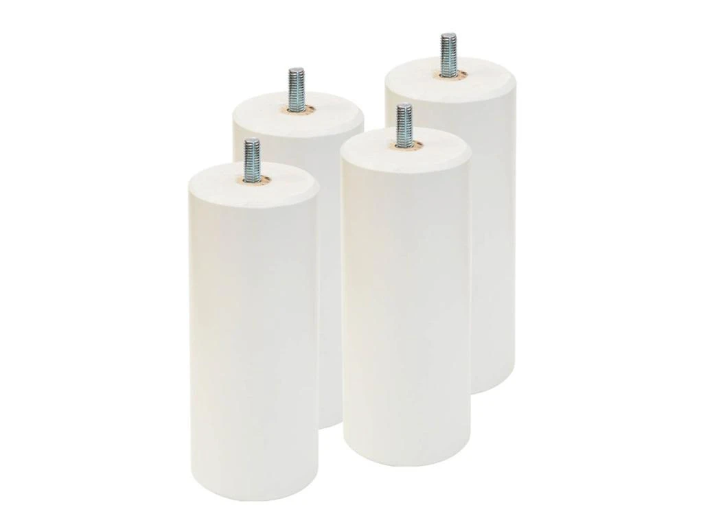 Pieds : Jeu de 4 pieds en hêtre massif teinté blanc pour sommier tapissier. Hauteur : 15 cm. Diamètre Pied : 6 cm. Diamètre tige filetée : 8 mm.