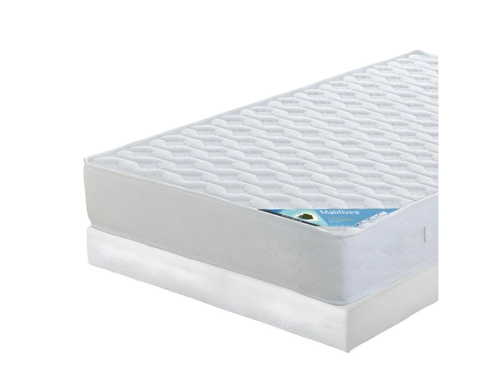 Matelas Maldives : Mousse Aertech plus H:18 cm, densitĂ© 35 Kg/m3, Housse supĂ©rieure et infĂ©rieure matelassĂ©e fixe composĂ©e de Tissu Stretch anti-acariens et hypoallergĂ©nique 100% polyester 180 g/m2, Rembourrage Thermoflex B 450 g/m2 ( 60% Coton, 40% polyester) et Bordage pĂ©rimetral matelassĂ© avec 4 poignĂ©es et 2 aĂ©rateurs. Confort : Soutien ferme, accueil semi ferme – Hauteur 21 cm – GARANTIE 5 ANS.