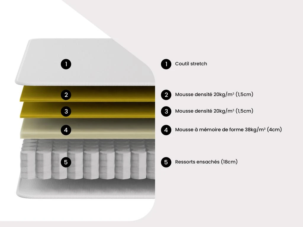 Technique de pointe en matière de ressorts; chaque ressort est emballé dans une enveloppe fermée lui permettant de bouger individuellement et offrant ainsi un soutien point par point très précis et une excellente indépendance de couchage