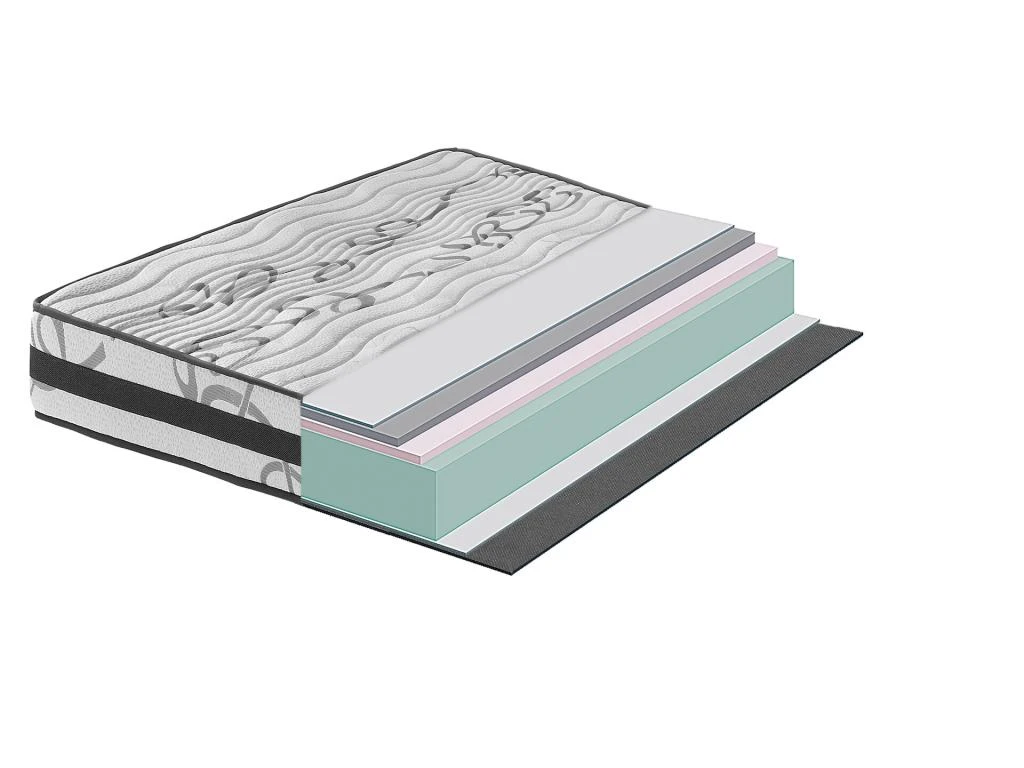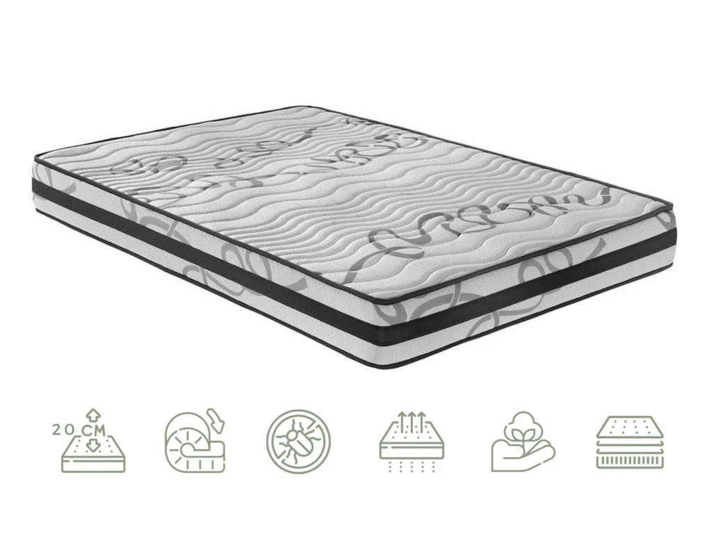 - Matelas de 20 cm de hauteur avec 2 cm de couche vicoélastique « à mémoire de forme » d’une densité de 55kg/m3.