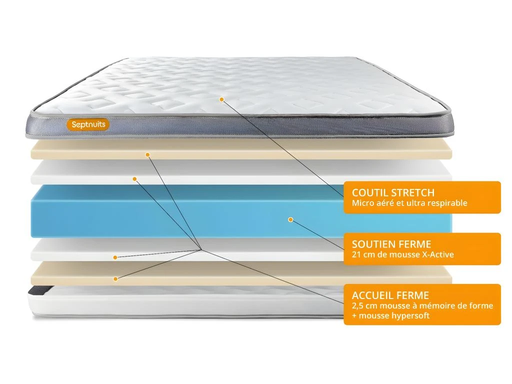 Le matelas Memo Zen de la marque Septnuits bénéficie des dernières innovations en matière de mousse à mémoire de forme pour vous offrir le confort et le soutien unique pour un sommeil récupérateur. Avec un soutien ferme, son accueil à mémoire de forme s’adapte parfaitement à votre morphologie et allège les points de pression en épousant parfaitement votre corps. Ses matériaux de haute qualité : Plate-bande 3D micro aérée, son coutil ultra respirable et sa fibre polyester vous garantissent une aération totale du matelas pour une hygiène optimale.