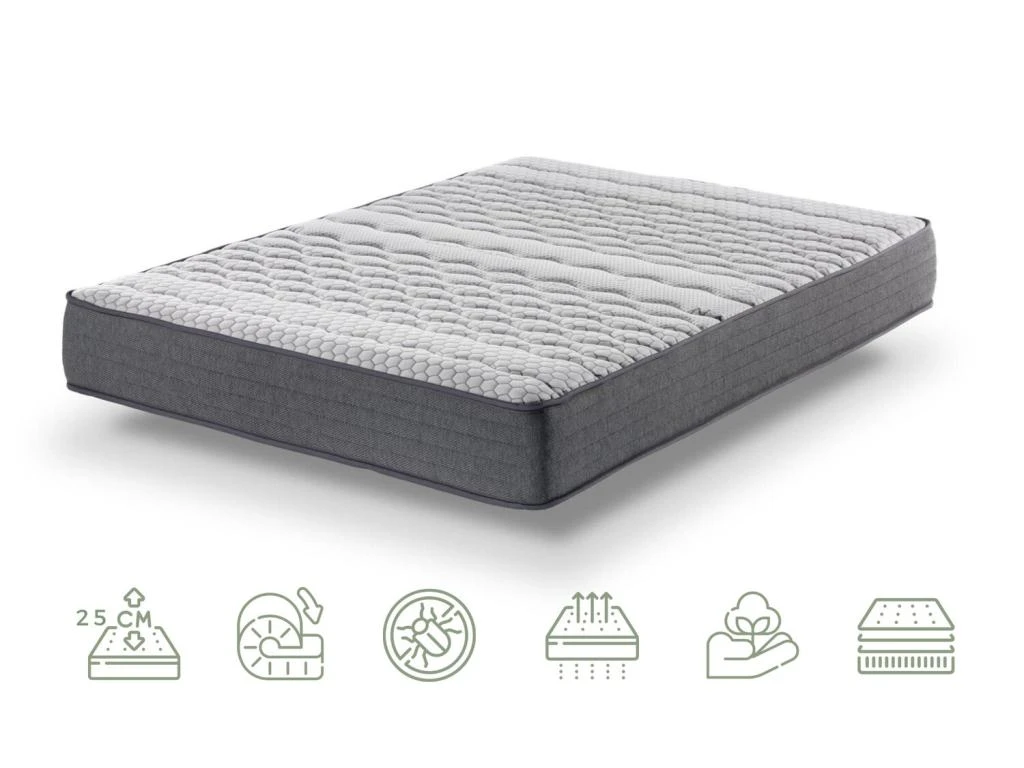 - Matelas de 25 cm de hauteur avec couche de mousse à mémoire de 3 cm « à mémoire de forme » d’une densité de 55kg/m3.