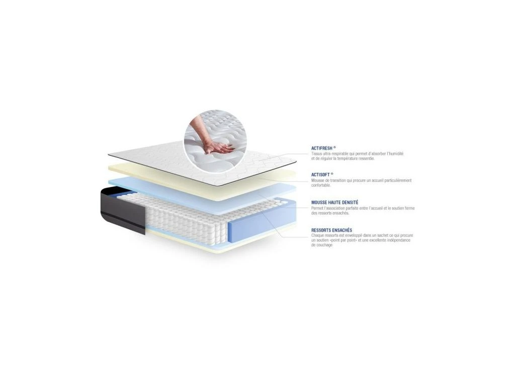 Actisom vous propose le matelas Actiflex NIGHT aux propriétés exceptionnelles, au confort unique et durable. Doté de la technologie Actisoft il procure un accueil particulièrement confortable. La technologie ressorts ensachés permet une parfaite ventilation du matelas et un soutien précis point par point de votre corps. Vos cycles de sommeil sont améliorés et vos douleurs dorsales sont soulagées.