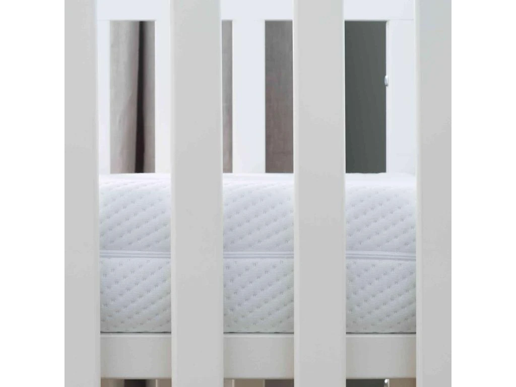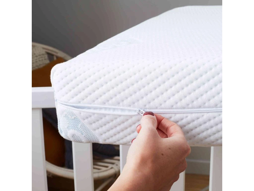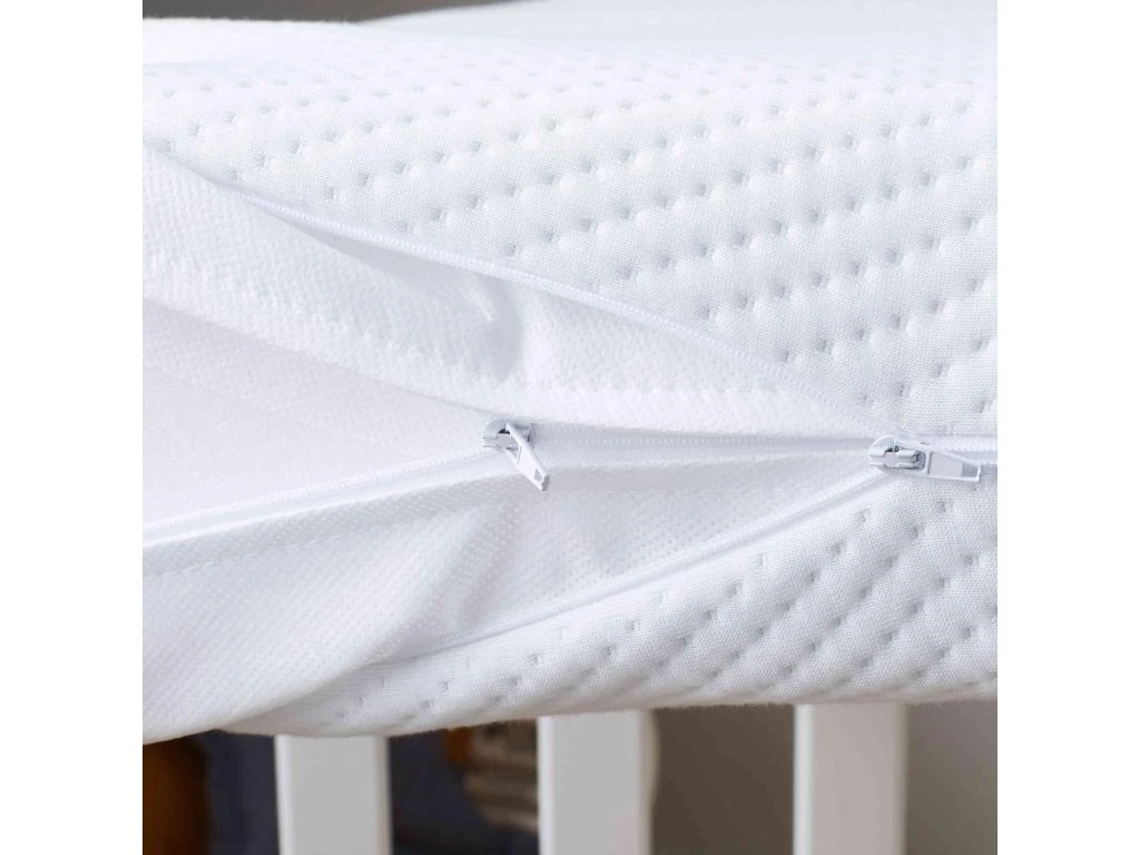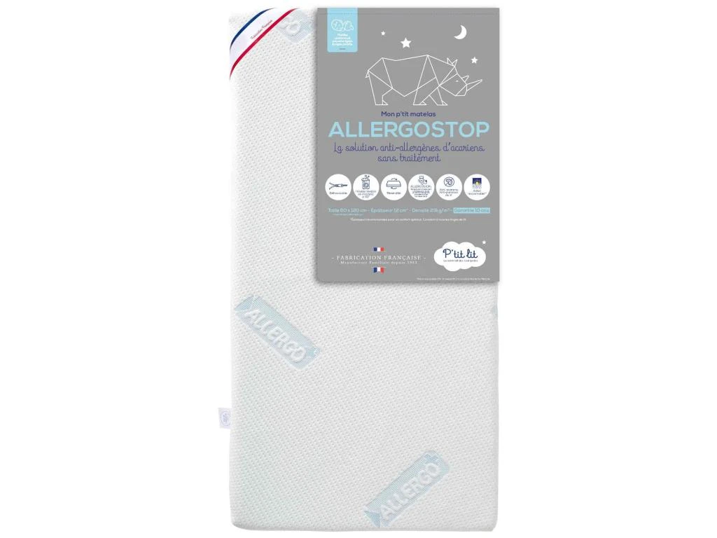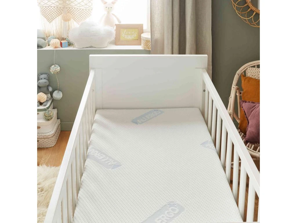 Matelas bébé double faces à traitement AllergoStop® anti-allergènes, housse déhoussable et lavable en machine à 40°C. Filtre à 99,9% les allergènes d’acariens !